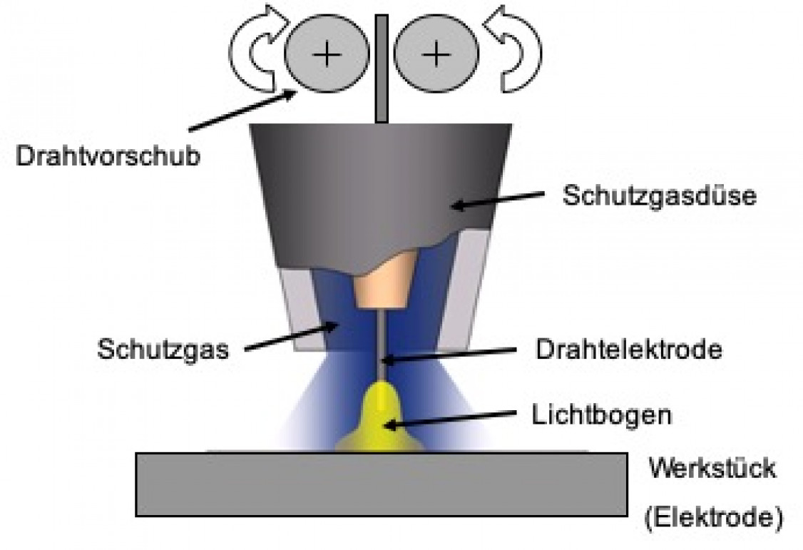Das Metall-Schutzgasschweißen arbeitet mit einem Zusatzstoff in Form eines endlosen Schweißdrahts. Dieser wird stark erhitzt und unter einer Schutzgasabdeckung abgeschmolzen. Ein so genannter Lichtbogen produziert dabei die Energie, die man für das Schmelzen des Zusatzwerkstoffes benötigt. Der Lichtbogen besteht aus ionisiertem Schutzgas, das sich bildet, wenn der Lichtbogen gezündet wird. Durch die extrem hohen Temperaturen bei der Zündung spaltet sich das neutrale Schutzgas in positiv geladene Atomrümpfe und negativ geladene Elektronen. In der Regel liegt das Werkstück am negativen Pol des Schweißkreises an und es entsteht zwischen der Drahtspitze und dem Werkstück eine Lichtbogensäule. In dieser schmilzt der Draht mit Zusatzwerkstoff ab und gelangt ins Schweißbad.