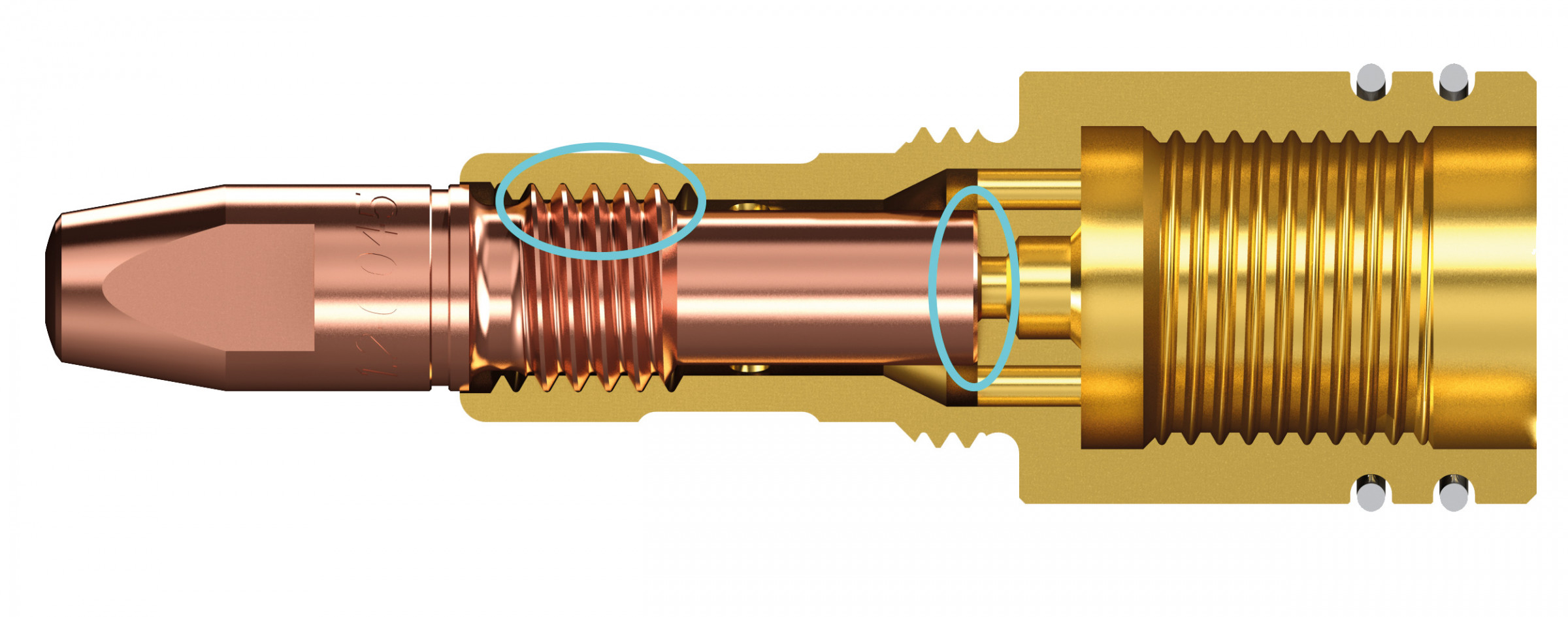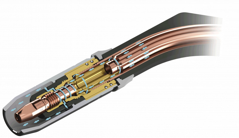 Außerordentliche Kühlung – unsere patentierte Gasströmungstechnologie verwendet das Schutzgas, um die Stromdüse und den Brennerhals zwangsweise zu kühlen.