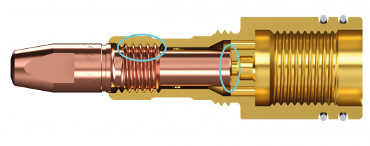 Verlängerte Lebensdauer von Verbrauchsmaterialien – die Stromdüsen halten doppelt so lange wie bei herkömmlichen Geräten, denn die Doppelkontaktpunkte der Brenner führen zu maximaler Stromübertragung. Reduzierung der Verbrauchsmaterialien um bis zu 70 Prozent.