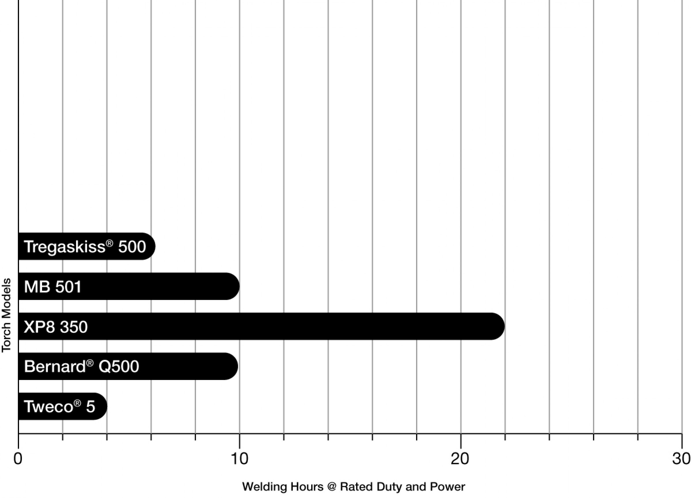 Reduzierte Ausfallzeiten – Produktivität ist der Schlüssel. Der branchenführende Arbeitszyklus des XP8 von 80 Prozent bei luftgekühlten Brennern lässt Sie länger schweißen, denn die XP8-Schweißbrenner reduzieren Ausfallzeiten um bis zu 50 Prozent.