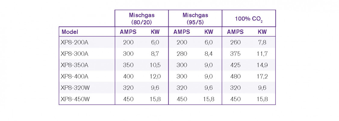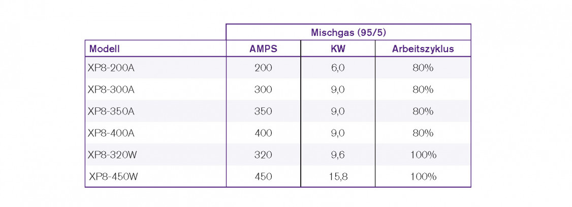 Stromstärken und Arbeitszyklen allein sind willkürliche Größenwerte für die Brennerfähigkeit. Der XP8 ist als Richtlinie in Ampere angegeben. Für eine genauere Bewertung berücksichtigen wir jedoch Kabeltyp, Gastyp, Durchflussrate und Leerlaufspannung und verwenden die Kilowattanforderungen der Anwendungen.