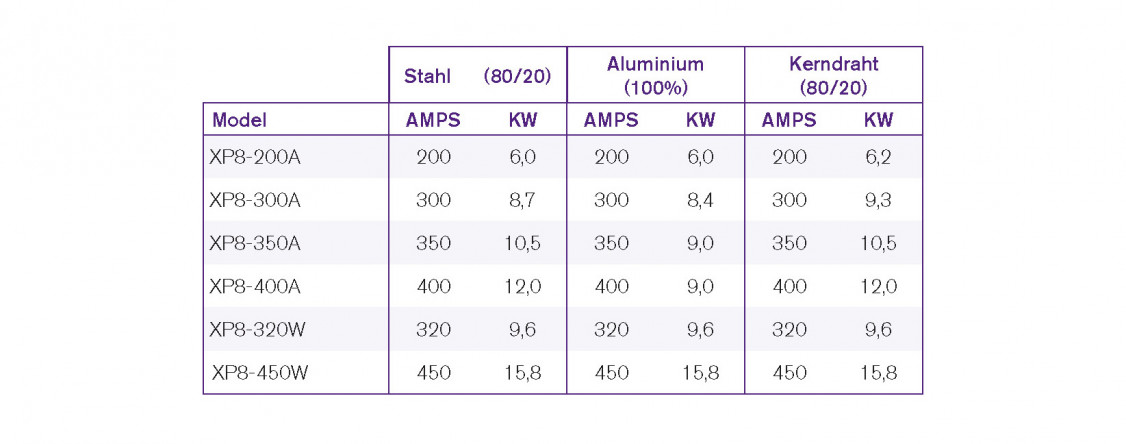 Die Wirkung des Impulsschweißens auf luftgekühlte Brenner ist extrem. Bei den XP8-Brennern ist der Effekt bei Verwendung des Impulsprozesses für alle Drahttypen ähnlich.