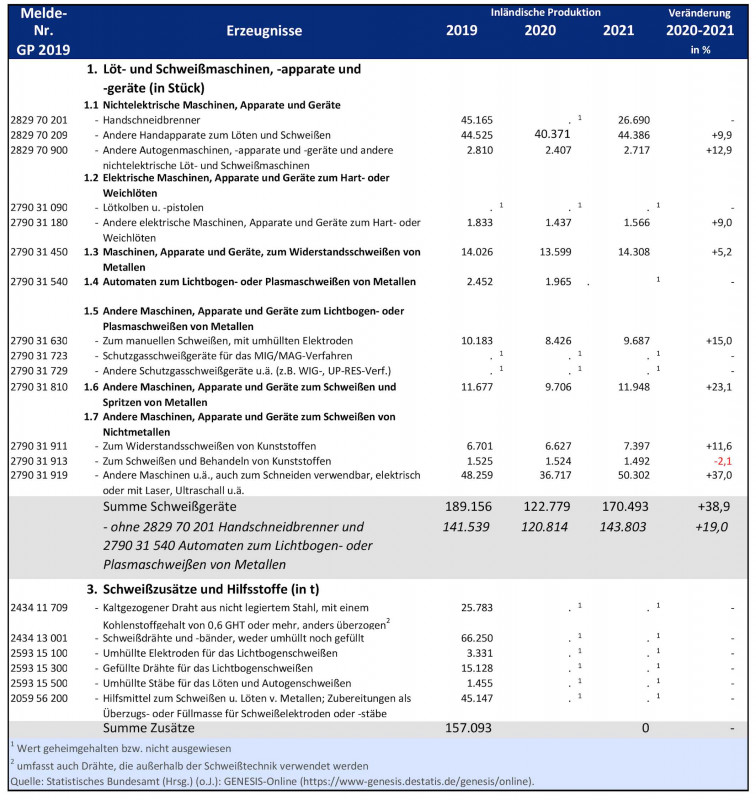 • „Andere Geräte und Anlagen zum Lichtbogen- oder Plasmaschweißen: Generator, rotierender Umformer oder Stromrichter zum manuellen Schweißen“ (4,9 Mio. Euro; 6,2 Mio. Euro; 7,0 Mio. Euro) und Schutzgasschweißgeräte MIG/MAG, WIG-, UP-, RES-Verfahren“ (29,2 Mio. Euro; 34,7 Mio. Euro; 41,3 Mio. Euro)