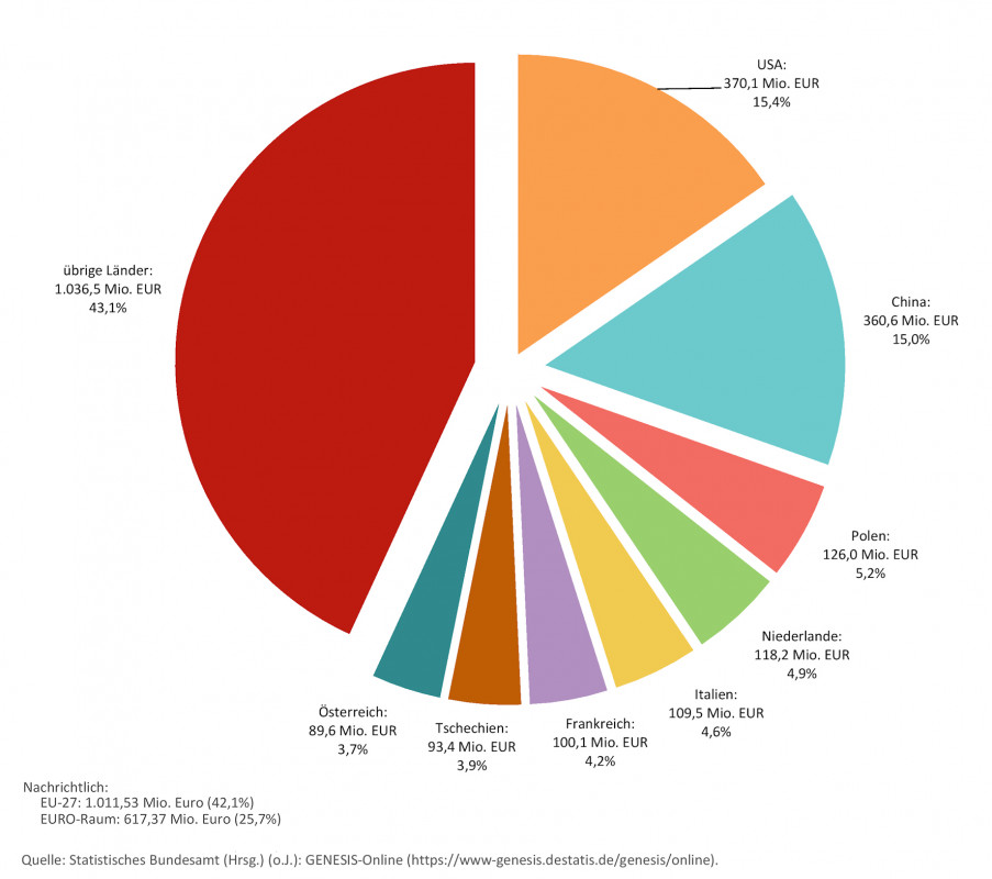In die zehn Hauptabnehmerländer flossen auch 2021 knapp 62% der Ausfuhren. Im Einzelnen handelt es sich dabei neben den USA, China und Polen um die Niederlande, Italien, Frankreich, Tschechien, Österreich, Ungarn und Mexiko. Die Exporte in die Niederlande haben sich gegenüber 2021 mit +95,6% auf 118,2 Mio. Euro fast verdoppelt, das Land hat damit gegenüber 2020 sechs Plätze gut gemacht. Die nachfolgenden Länder sind dadurch trotz positiver Wachstumsraten um jeweils einen Platz nach hinten gerutscht. Den geringsten Anstieg verzeichnete Italien mit +5,7% auf 109,5 Mio. Euro, Frankreich verzeichnete +16,7% auf 100,1 Mio. Euro. Zugenommen haben auch die Lieferungen nach Tschechien und Österreich. Die Lieferungen nach Tschechien stiegen um 25,5% auf 93,4 Mio. Euro, die nach Österreich um 27,3% auf 89,6 Mio. Euro. Damit konnte der rückläufige Trend der letzten Jahre erstmalig umgekehrt werden. Einzig die Ausfuhren in die Schweiz (-2,6% auf 57,9 Mio. Euro) und Russland (-6,9% auf 57,5 Mio. Euro) waren rückläufig. Betrachtet man die Entwicklung über die zehn Hauptabnehmerländer, sind die Exporte im Durchschnitt um 69,5% gestiegen.