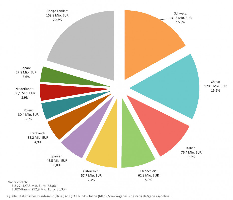 Bezieht man die zehn Hauptlieferantenländer mit ein, zu denen noch Spanien, Frankreich, Polen, die Niederlande und Japan gehören, mit ein, dann lieferten diese Staaten mehr als vier Fünftel der deutschen Importe (80,3%). Aus der Schweiz wurden Waren im Wert von 131,5 Mio. Euro bezogen, was gegenüber 2020 einen Zuwachs von +26,1% bedeutet. Der Importanteil lag mit 16,8% um 1,7%-Punkte über dem Anteil des Vorjahres. Die Importe aus China nahmen um 7,6% zu und erreichten 120,8 Mio. Euro, der Anteil an den Gesamteinfuhren (15,5%) war insgesamt leicht rückläufig (-0,7%-Punkte). Die Lieferungen Italiens nahmen kräftig um 29,9% auf 76,4 Mio. Euro (Anteil 9,8%) zu, die aus Tschechien um 8,6% auf 62,8 Mio. Euro (Anteil 8,0%). Die Einfuhren aus dem letzten Top-5-Land Österreich nach Deutschland sanken um 7,3% auf 57,7 Mio. Euro. Die Bezüge aus Spanien sind sprunghaft um 172,0% auf 46,5 Mio. Euro gestiegen und machten 6,0% der deutschen Importe aus. Damit konnte sich Spanien im Vergleich zu 2020 um sechs Plätze verbessern. Die deutschen Bezüge aus Frankreich sind um 29,5% auf 38,2 Mio. Euro gestiegen (Einfuhranteil 4,9%), die aus Polen um 53,1% auf 30,4 Mio. Euro (Anteil 3,9%). Leicht rückläufig waren die Importe aus den Niederlanden. Sie sanken um -4,3% auf 30,1 Mio. Euro (Anteil 3,9%). Waren die Importe aus Japan in 2020 noch deutlich gestiegen (Platz 6; Anteil 5,2%), fielen sie 2021 stark um 23,3% auf 27,8 Mio. Euro (Anteil 3,6%). Japan belegt damit nur noch Platz 10.