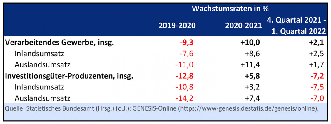 Im vierten Quartal 2021 setzte sich die weltwirtschaftliche Erholung insgesamt noch unvermindert fort, nicht zuletzt, weil die Corona-Pandemie die wirtschaftlichen Aktivitäten außerhalb Chinas immer weniger belastet. Die Maßnahmen zur Eindämmung der Pandemie wurden in den meisten Ländern weitgehend aufgehoben, zudem sind die vorherrschenden Omikron-Varianten für Geimpfte und Genesene weniger gefährlich. Der Konjunkturverlauf setzt sich in den einzelnen Regionen allerdings unterschiedlich fort. Insbesondere im Euroraum kühlte sich die Konjunktur infolge einer neuen Pandemiewelle deutlich ab, die Expansionsrate betrug im Vergleich zum Vorquartal lediglich 0,3%. Die gesamtwirtschaftliche Produktion in den USA expandierte kräftig mit 1,7% gegenüber dem Vorquartal. Auch in China beschleunigte sich die Expansion trotz der Schuldenprobleme im Immobiliensektor und verhaltener Investitionstätigkeit auf 1,6%. Offenbar haben die Produktionsengpässe insbesondere im Energiesektor weniger gedämpft als in den Quartalen zuvor. Der Welthandel mit Waren hat nach einer Phase der Stagnation im Sommer zu Jahresende 2021 wieder deutlich zugenommen, gegenüber dem Vorquartal um 2,5%. Die seit dem Einbruch vom Frühjahr 2020 insgesamt hohe Dynamik ist auch darauf zurückzuführen, dass sich die Nachfrage wegen der Pandemie von personennahen Dienstleistungen auf handelbare Güter verlagert hat. Der starke positive Trend in der Umsatzentwicklung im Ver-arbeitenden Gewerbe und bei den Investitionsgüterproduzenten aus dem Jahreswechsel 2020/2021 hat sich im ersten Quartal 2022 gegenüber dem vierten Quartal 2021 nicht fortgesetzt. Das Verarbeitende Gewerbe konnte immerhin noch ein Plus von 2,1% verzeichnen, die Investitionsgüterproduzenten mussten einen Rückgang von 7,2% hinnehmen (Tabelle 6).