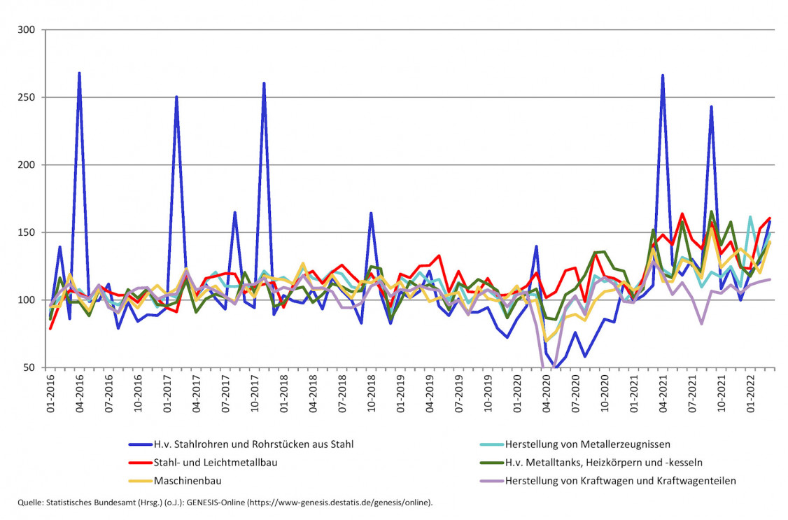 Die Auftragseingänge verzeichneten mit Beginn des ersten Quartals des Jahres 2021 eine generell steigende Tendenz und setzten damit den positiven Rebound-Effekt des dritten und vierten Quartals 2020 fort. Insgesamt verblieben diese über alle Quartale auf einem höheren Niveau als im Betrachtungszeitraum seit dem ersten Quartal 2016. Lediglich die Hersteller von Kraftwagen und Kraftwagenteilen mussten im zweiten und insbesondere dritten Quartal starke Einbußen hinnehmen. Die Auftragseingänge der Hersteller von Stahlrohren und Rohrstücken aus Stahl waren stark volatil, ähnlich wie in den Jahren 2016 bis 2018. Im ersten Quartal 2022 setzte sich der positive Trend fort (Bild 4).