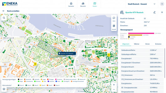 Die von der ENEKA Energie und Karten GmbH (Rostock) entwickelte kartografische Software-Toolbox unterstützt Kommunen bei der Energie- und insbesondere der Wärmeplanung. Durch die Ausrichtung auf Prozesse und Gebäude ermöglicht sie eine enorme Zeitersparnis bei Planungsvorhaben, der Identifizierung von effizienten Maßnahmen und der Erfüllung von Berichtspflichten.
