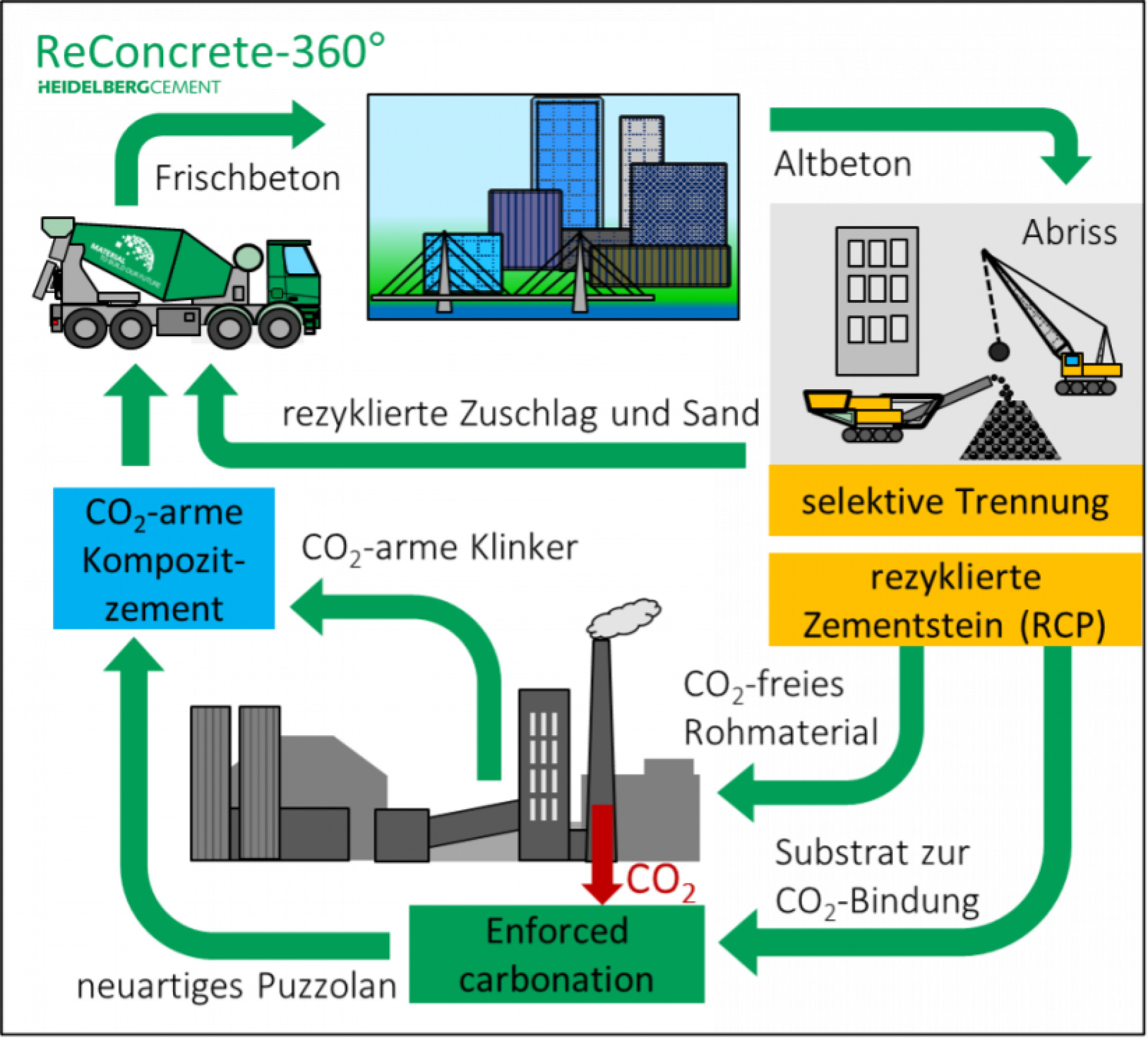 Die HeidelbergCement AG (Heidelberg) gewinnt mit ReConcrete-360°, einem Verfahrenskonzept zur Kreislaufwirtschaft von Beton, Zuschlagstoffen, Zement und CO2. Der aus Altbeton abgetrennte Zementstein dient als Ersatz für Kalkstein und als reaktiver Zementbestandteil. Für Deutschland liegt das CO2-Einsparpotential durch dieses Verfahren bei 10 Millionen Tonnen pro Jahr.