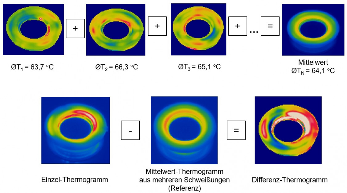 Anhand von Temperaturunterschieden einzelner Pixel können visuelle Unterschiede nachvollziehbar dargestellt und messtechnisch erfasst werden. Hierdurch kann beispielsweise eine schnelle Gegenüberstellung von verschiedenen Schweißungen zu einer Referenz (z. B. Mittelwert eines Prozesses) erfolgen. Eine solche Auswertungsmethode war Grundvoraussetzung, um schnell eine Vielzahl an Schweißungen betrachten zu können, wie es für den Ultraschallschweißprozess bei Schweißzeiten von unter einer Sekunde erforderlich ist.