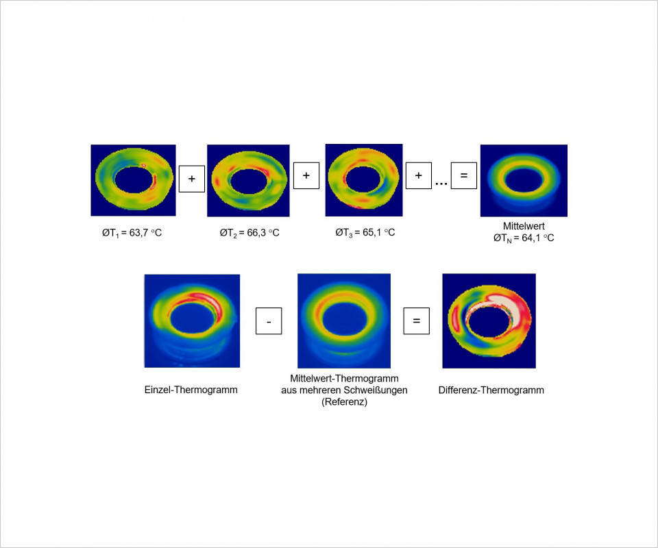 Üblicherweise werden zur Erfassung eines Thermogramms sogenannte Histogramme erstellt, mit deren Hilfe zahlenmäßig erfasst werden kann, wie häufig eine Temperatur in einem Thermogramm vorhanden ist. Um effizient eine Vielzahl an Schweißungen thermografisch auswerten zu können, wurde am SKZ eine Auswertungssoftware weiterentwickelt. Mit dieser Software können schnell rechnerische und visuelle Mittelwerte aus mehreren Schweißungen erzeugt werden. Diese Software ermöglicht neben der klassischen Temperaturmessung und -aufzeichnung zudem die Erstellung von so genannten Differenzbildern.