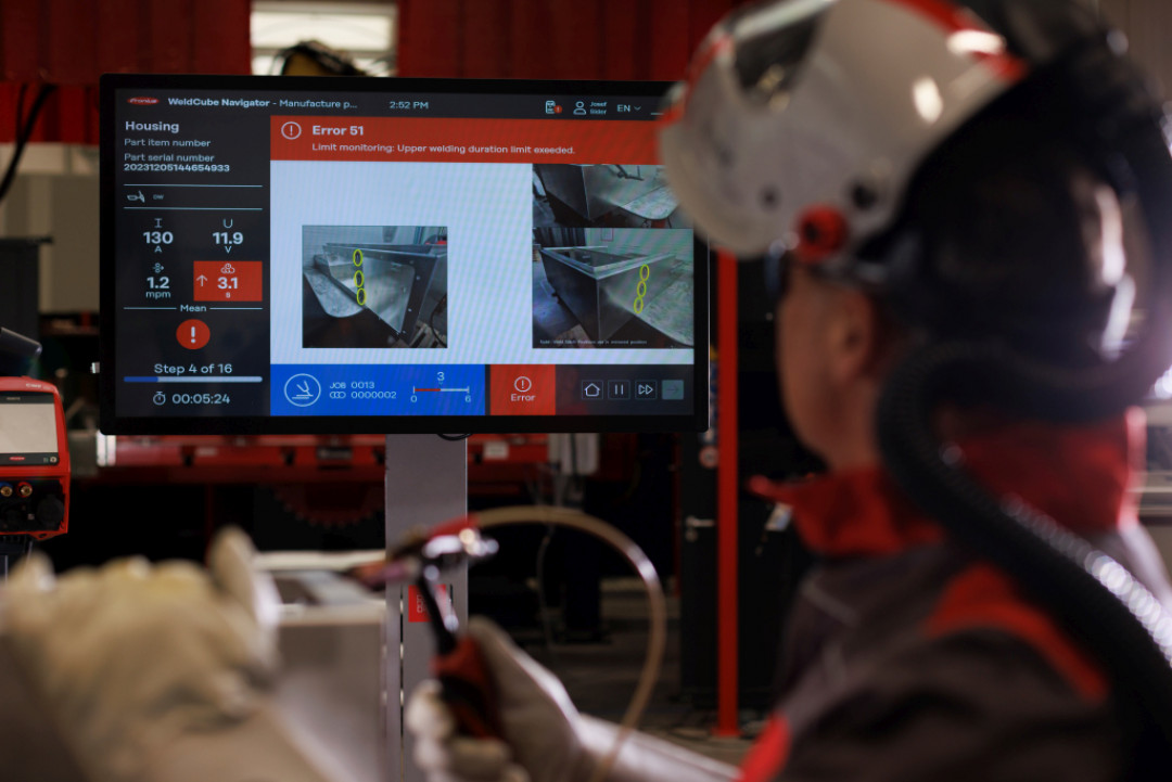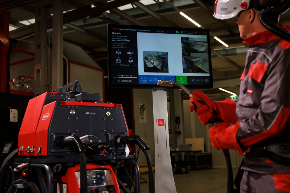 Die Schweißerin oder der Schweißer bekommt am Arbeitsplatz von der WeldCube-Navigator-Software angezeigt, was als Nächstes wie zu tun ist. Auf einem extra Bildschirm wird jeder Arbeitsschritt eines Bauteils in der richtigen Reihenfolge visuell dargestellt und die Schweißparameter des jeweiligen Jobs sind automatisch eingestellt. Die Arbeitskraft wird stufenweise durch ihre Aufgaben geleitet. So ist es ein Leichtes, die korrekte Schweißfolge einzuhalten sowie sicherzustellen, dass die definierten Parameter verwendet werden.