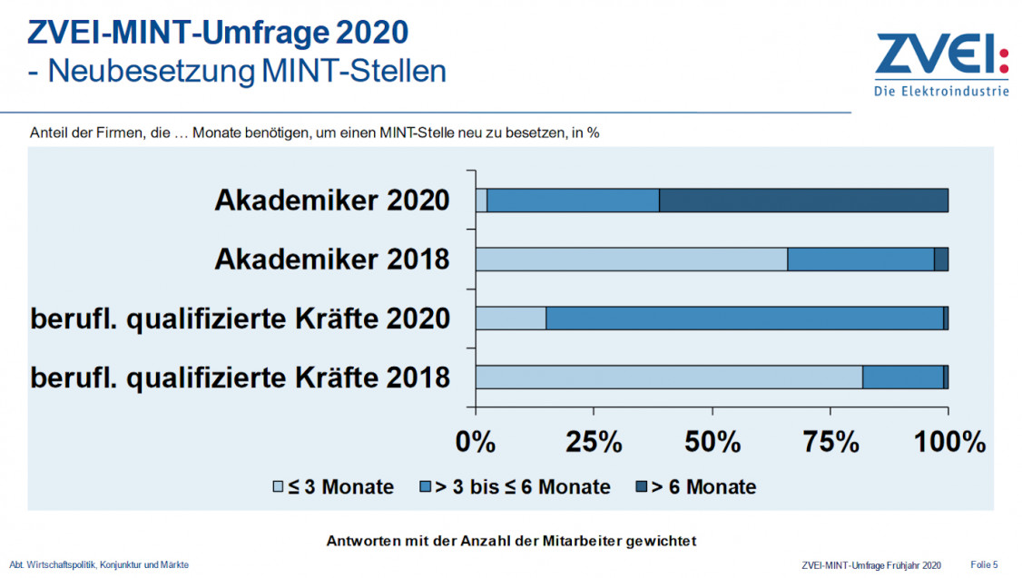 „Die Unternehmen der Elektroindustrie benötigen immer länger, um Neubesetzungen von Stellen vornehmen zu können“, so Dr. Gunther Kegel, Vize-Präsident des ZVEI – Zentralverband Elektrotechnik- und Elektronikindustrie. Er bezieht sich dabei auf eine aktuelle Umfrage, die der ZVEI unter seinen Mitgliedern durchgeführt hat: Danach geben 60 Prozent der Unternehmen an, dass die Neubesetzung von Stellen mit Akademikern aus dem MINT-Bereich (Mathematik, Informatik, Naturwissenschaft und Technik) länger als sechs Monate dauert. Nur bei 3 Prozent dauert der Neubesetzungsprozess weniger als drei Monate.