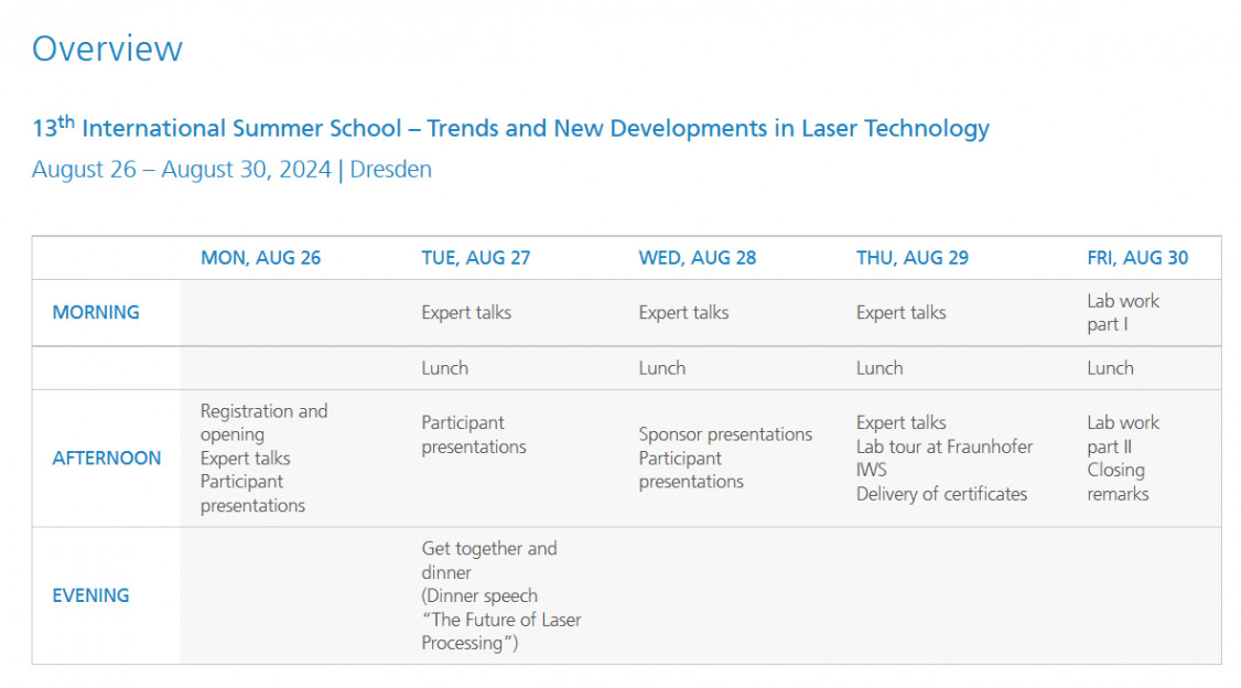 https://www.iws.fraunhofer.de/en/events/summer-school.htmlThe Technische Universität Dresden and Fraunhofer IWS are organizing the 13th International Summer School „Trends and New Developments in Laser Technology“ from 26 to 30 August 2024. This five days workshop aims to bring together undergraduate and PhD students in an intensive study program on fundamental and applied aspects of laser technology.