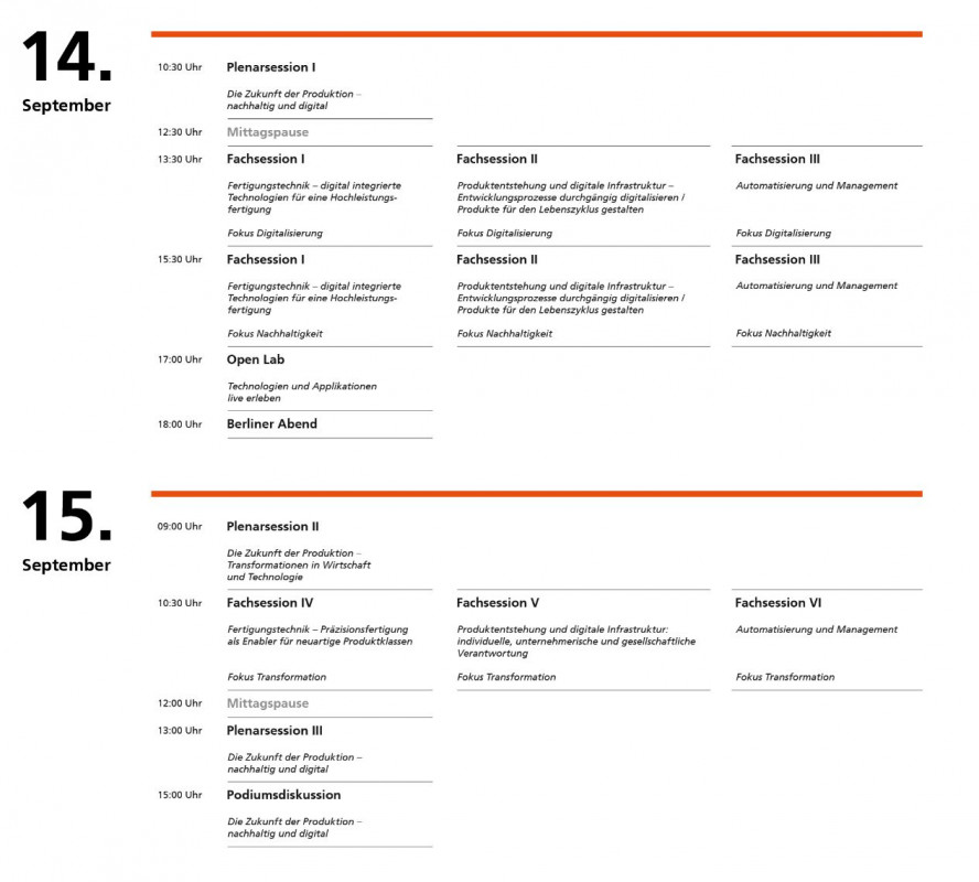 Sechs Fachsessions geben an beiden Konferenztagen detaillierte Einblicke in Technologien und Lösungen aus den Bereichen Hochleistungs- und Präzisionsfertigung, Produktentstehung und digitale Infrastruktur sowie Automatisierung und Management. Referentinnen und Referenten aus dem Maschinen- und Anlagenbau, der Automobil- und Zulieferindustrie, der Elektro- und Energietechnik sowie der Luft- und Raumfahrt stellen hier erfolgreiche Praxisbeispiele für eine ressourcenschonende und emissionsfreie Produktion vor. Mit technologieorientierten Transferpfaden durch ihre Versuchsfelder bieten Fraunhofer IPK und IWF der TU Berlin außerdem praktische Einblicke in ihre aktuellen FuE-Arbeiten.