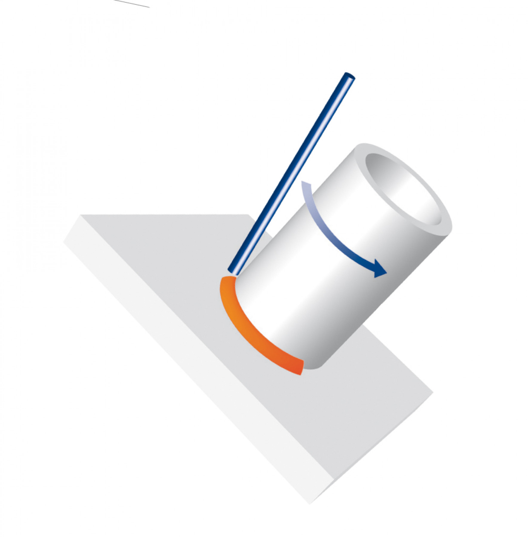 Die Schweißposition PJ-L045 gilt ebenfalls für das Schweißen von Rohren mit 45° geneigten Rohrachsen, allerdings für das Fallendschweißen (PJ).